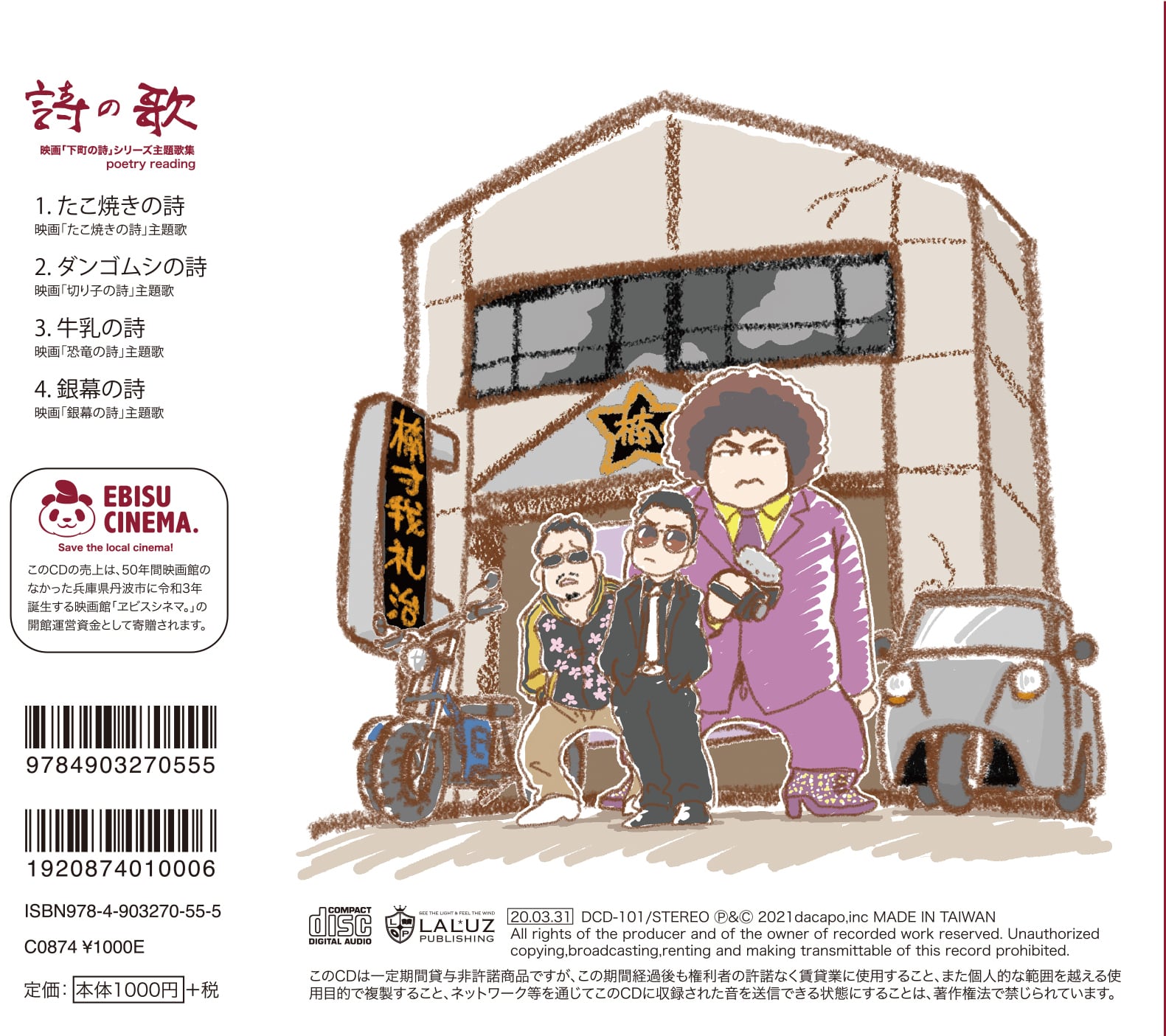 あの映画「下町の詩」シリーズの主題歌がCDになった。たこ焼きの詩、ダンゴムシの詩、牛乳の詩、銀幕の詩の4曲入り。近兼拓史監督の歌詞にワタナベフラワーが曲をつけるという下町コラボもこれで4曲目。今回のCDではその歌詞の誕生秘話もたっぷり書かれた12Pのブックレット付き。